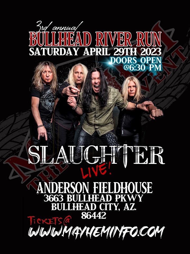 For 30 years Slaughter has been entertaining rockers of all ages with their award winning songs, videos and guest appearances with the greats such as KISS and Ozzy Osbourne. Their hit songs include Up All Night, Fly to the Angels, From the Beginning and Stick It Live. Slaughter will make their Bullhead City debut on Saturday April 29, 2023 in conjunction with the 3rd Annual Bullhead River Run, Mayhem the Main Event and the legendary Tattoo Convention. Opening for Slaughter will be Las Vegas alternative modern rock band, Crashing Wayward.